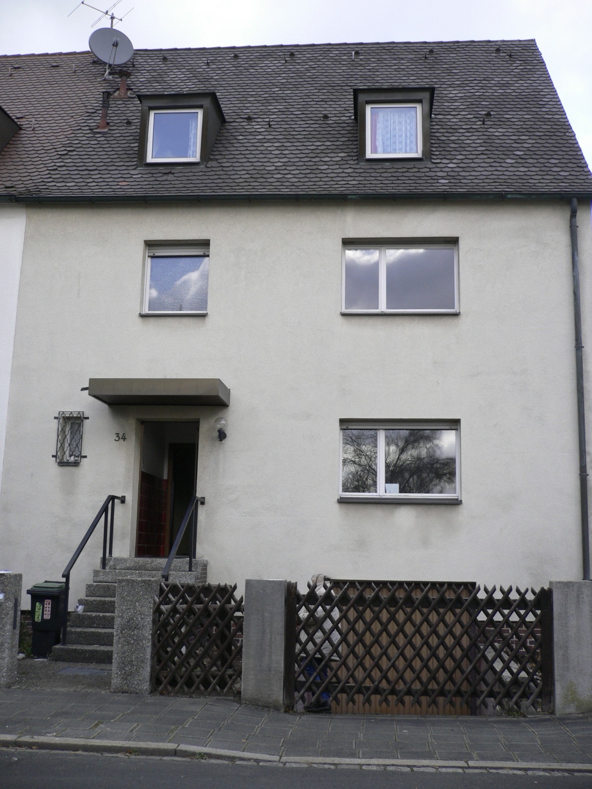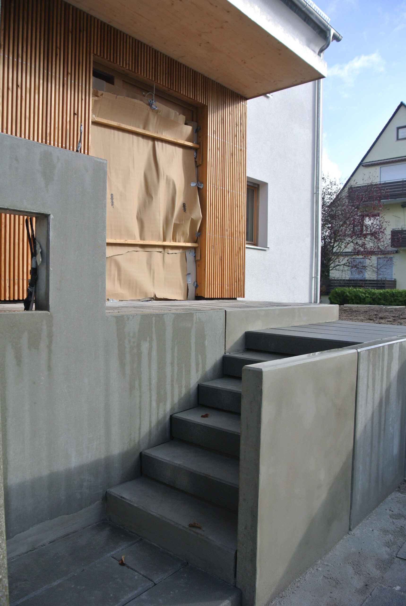 Durch eine Grundstückseinfriedung wurde das Gelände auf dem eigenen Grundstück angehoben, eine eingefasste Treppe definiert den Zugang zur Hauseingangstüre von der Straße aus.
