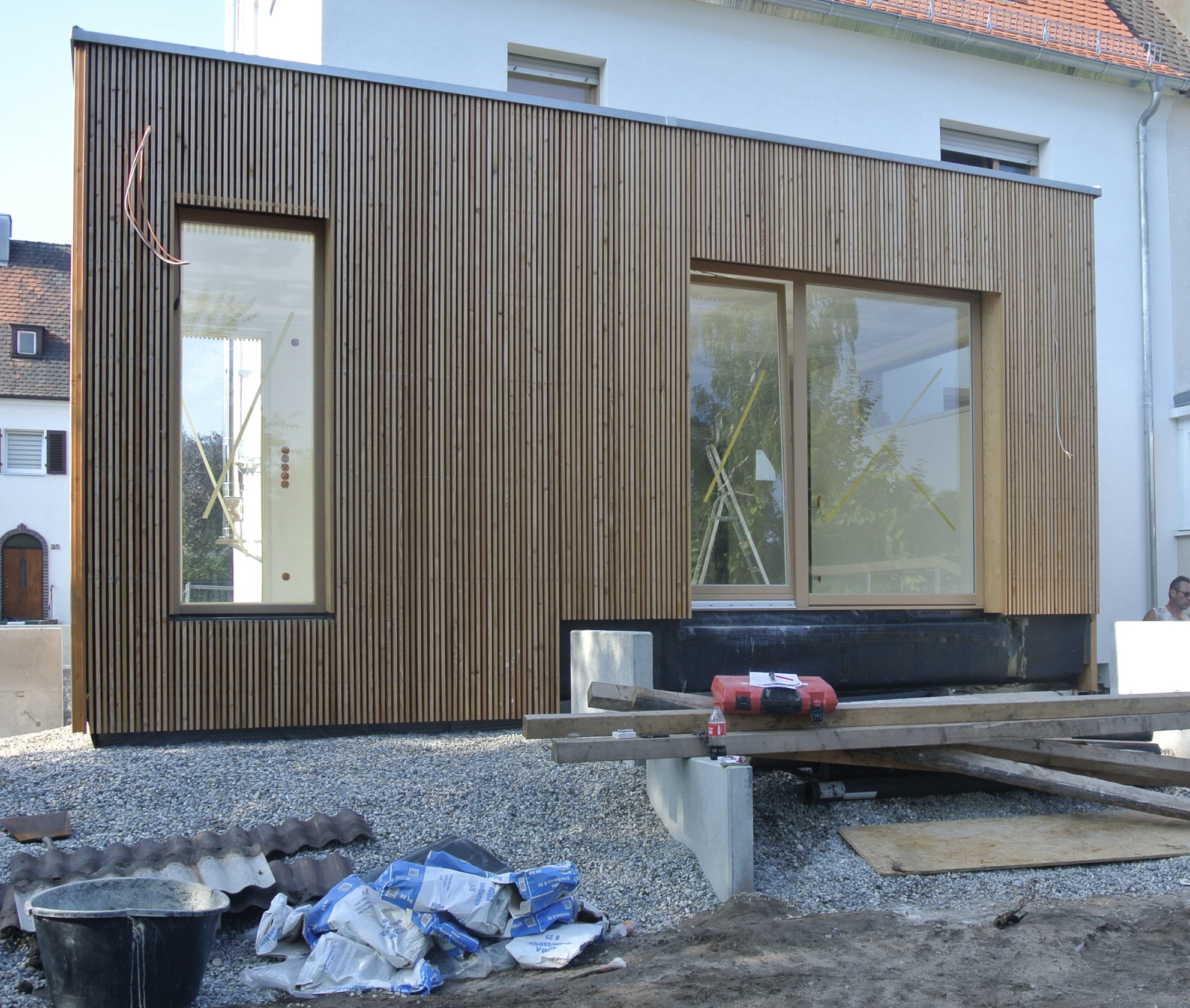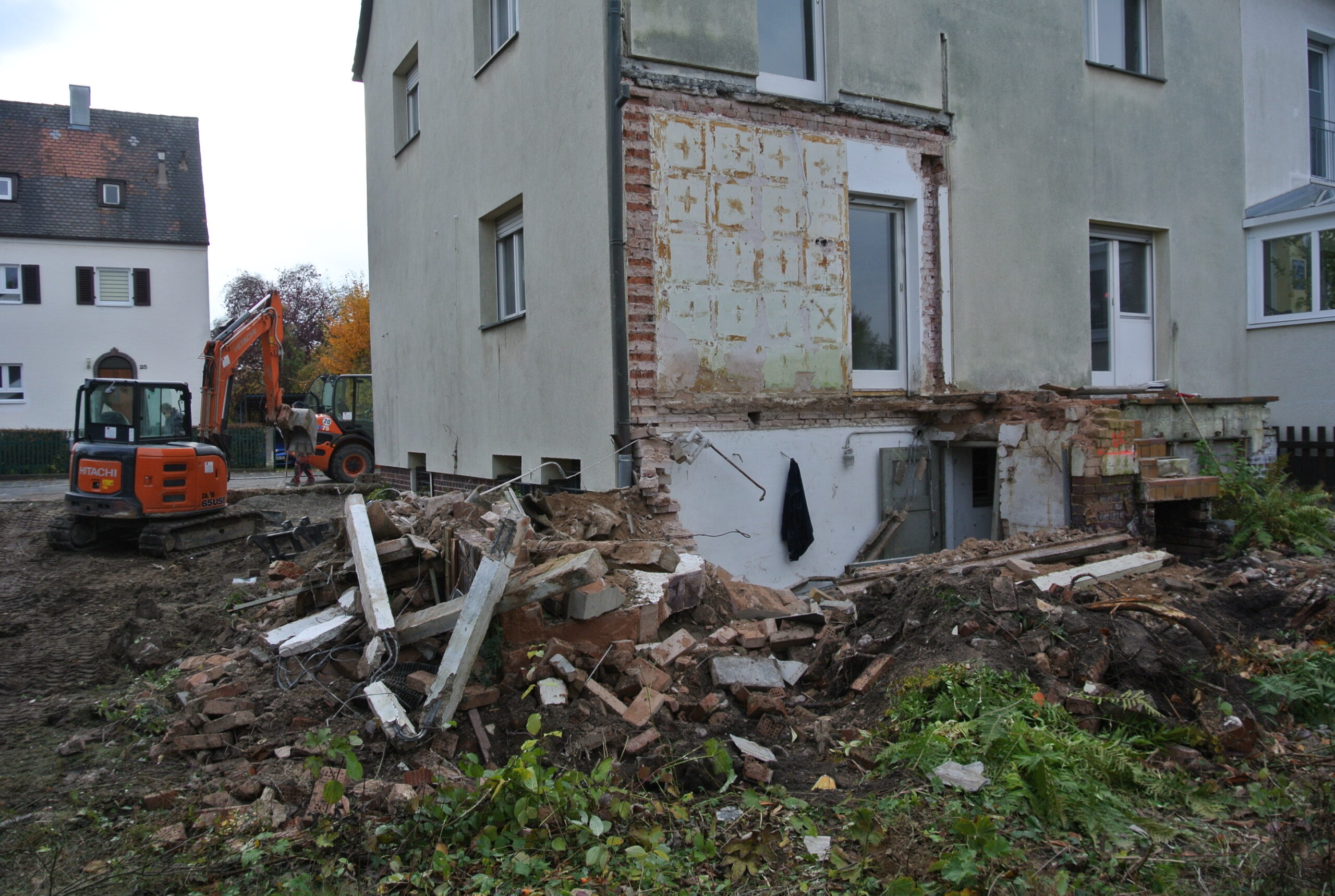 Bei der Kernsanierung einer Doppelhaushälfte aus den 1940er Jahren wurden massive Rückbaumaßnahmen wie die der straßenseitigen Garagensituation im UG samt Herstellen einer neuen Außenwand und der Rückbau eines gartenseitigen Erkers über EG und UG notwendig.