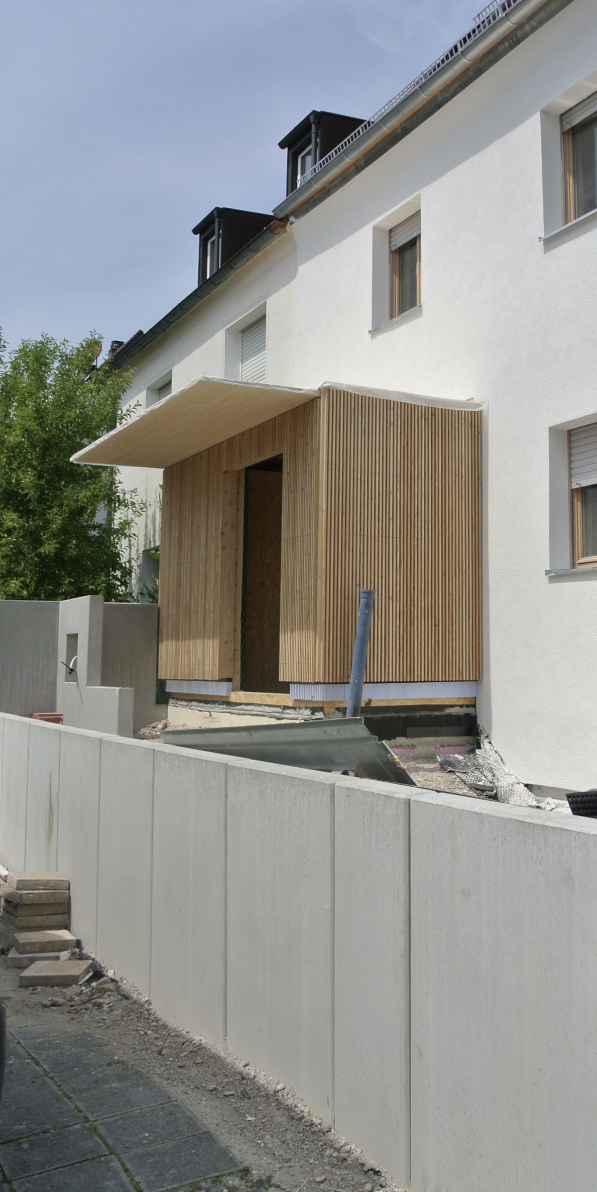 Insbesondere die Hauseingangssituation mit einem Höhenunterschied von über 1m zwischen dem Straßen– und dem Erdgeschossniveau wurde grundlegend verändert um eine klare Zonierung zwischen öffentlichen und privaten Freibereichen zu schaffen.