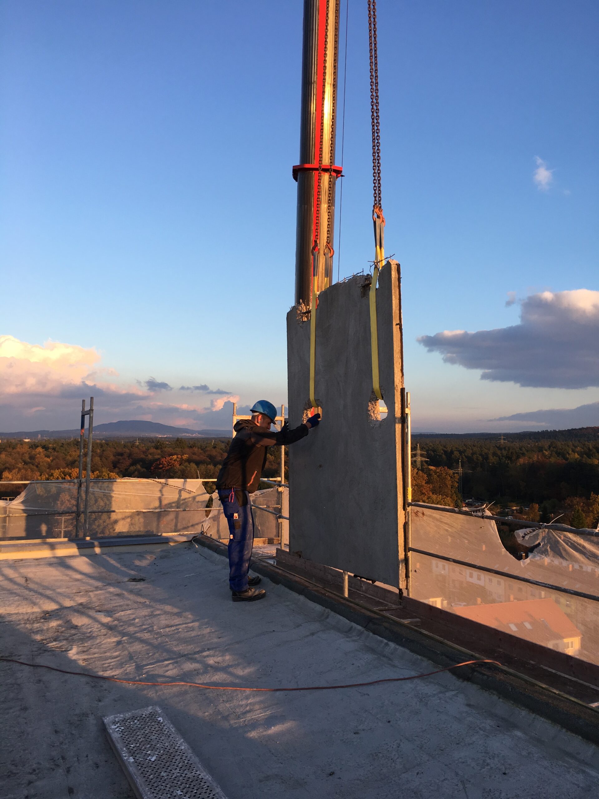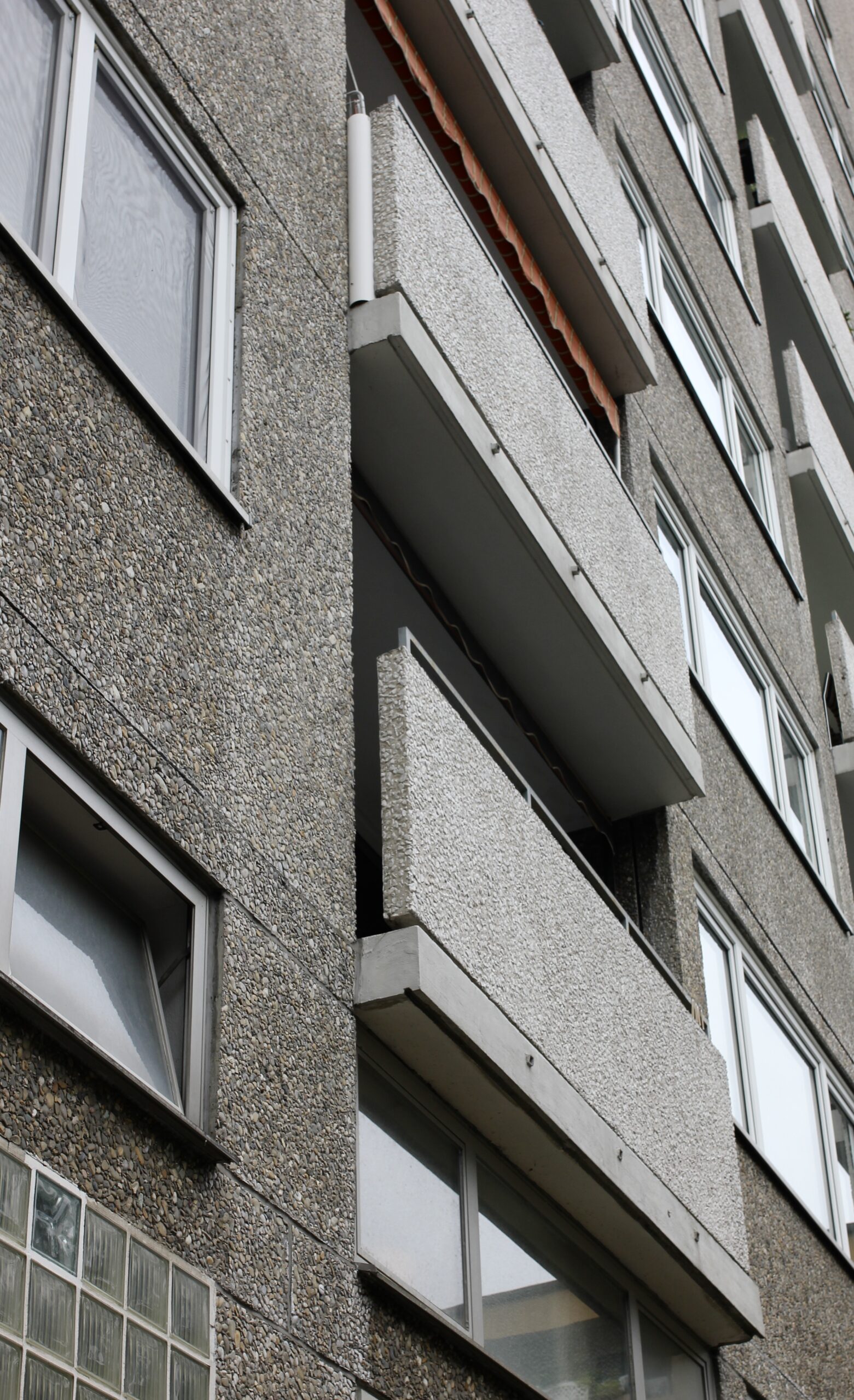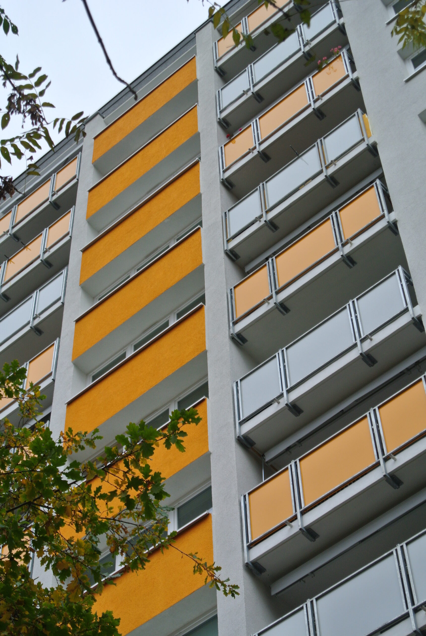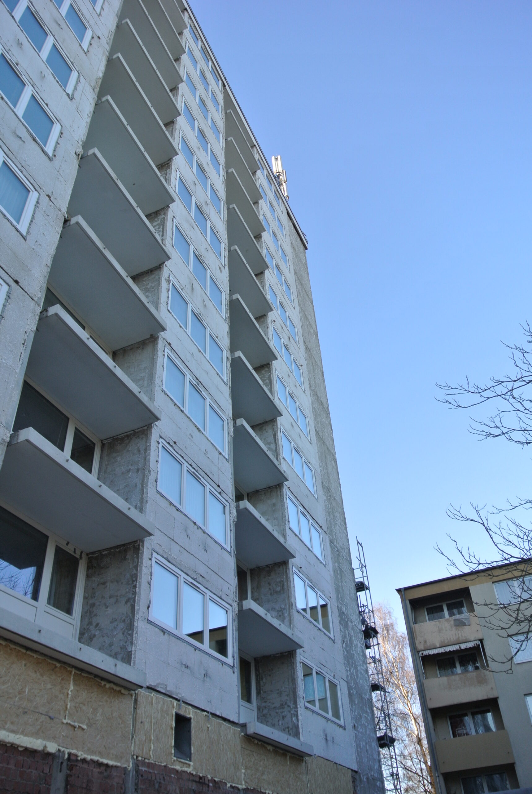Die Sanierungsmaßnahmen umfassten den kompletten Rückbau der Waschbetonfassade über alle 12 Geschosse hinweg, den Austausch sämtlicher Fassaden- und Brüstungselemente mit Erneuerung der Fenster, Betonsanierung an Balkonbrüstungen und Fassadenplatten mit Instandsetzung der Verankerungen sowie eine neue Flachdachabdichtung mit energetischer Ertüchtigung
