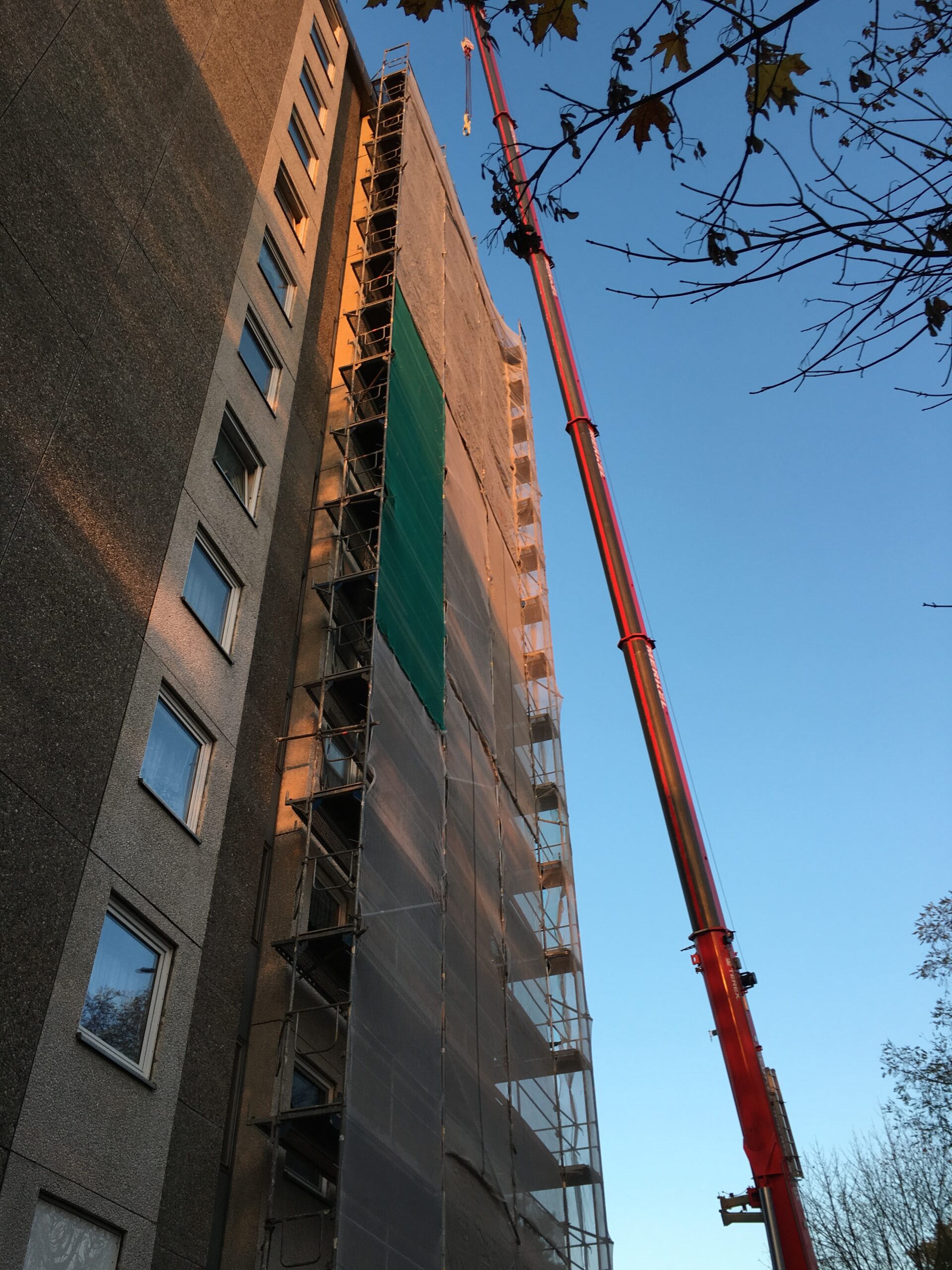 Fassadensanierung mit energetischer Ertüchtigung eines Hochhauses in bewohntem Zustand.